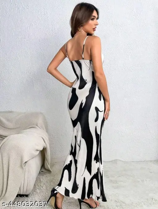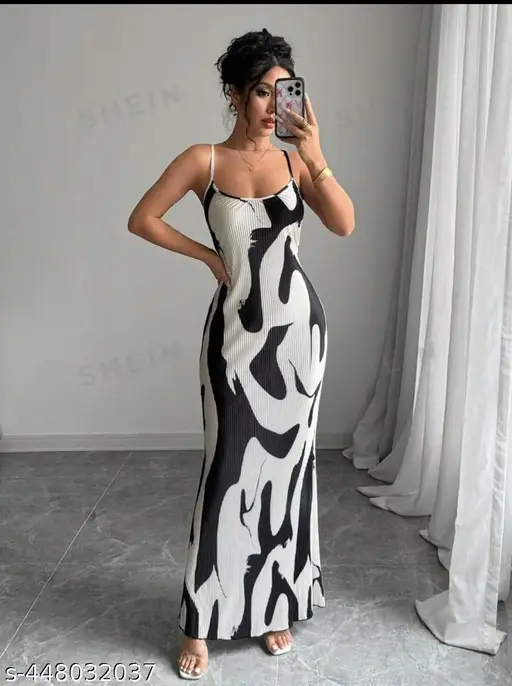 This sleeveless cami dress boasts spaghetti straps, a mermaid-shaped hem, and a dramatic thigh-slit—perfect for making a statement while staying cool and comfortable. The black and white palette adds sophistication, while the natural waistline ensures a flattering silhouette for all body shapes.