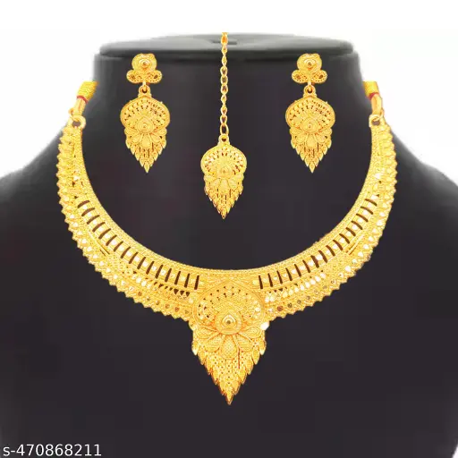 Introducing the SDR New Design Gold-Plated Necklace, Earrings & Maangtika Jewellery Set — a celebration of traditional elegance and bridal charm! Designed especially for women and girls who love to make a statement, this exquisite set features a radiant gold-plated finish and intricate detailing that adds depth and beauty to your festive or bridal look.